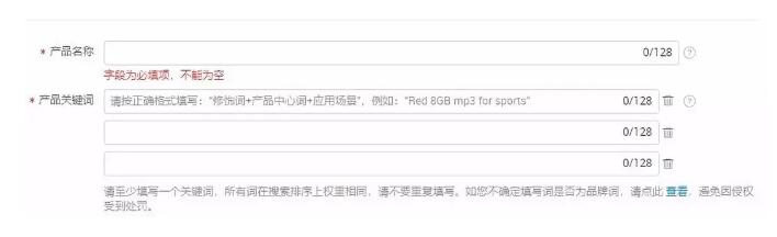 在今年阿里调整了产品关键词的长度限制,改为和标题一样都是128个字符,并且出现了默认的提示填写格式说明