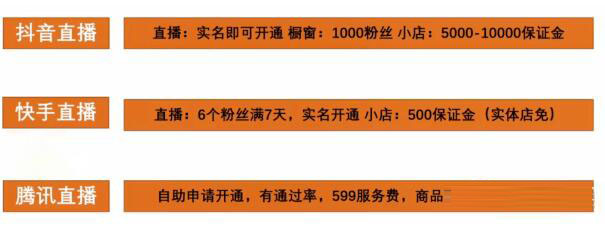 这三大平台的开通条件,抖音和快手直播都是实名,就可以开通。现在抖音直播连粉丝要求都没有了,就是我们的挂购物车还是需要1000粉丝的,而抖音的小店,它会根据你所经营的内幕,让你缴纳一定的保证金。