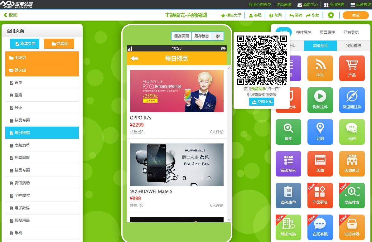 做完之后就点击右上角的生成,就可以生成自己做好的APP了,然后到管理界面来可以自己下载预览。